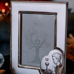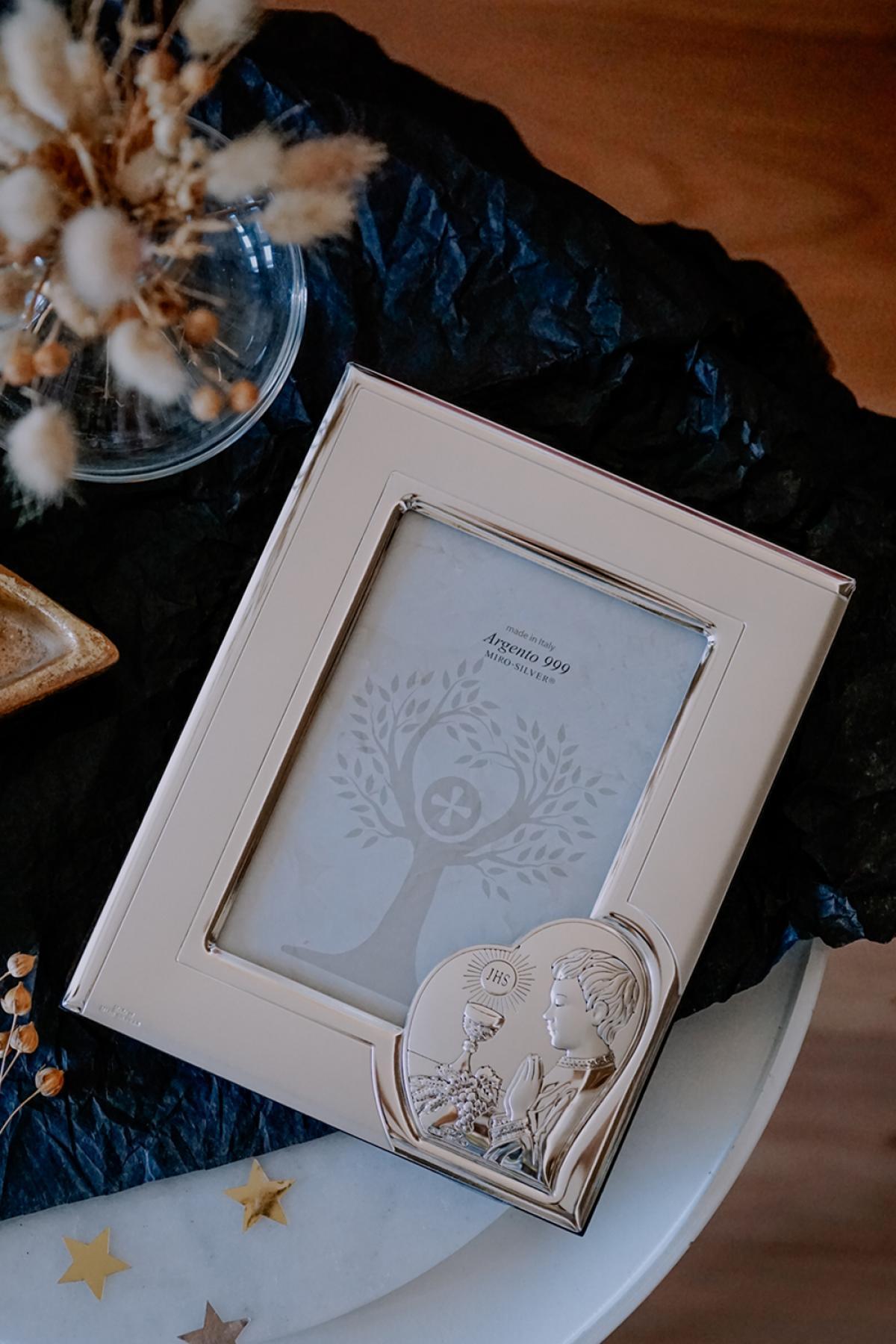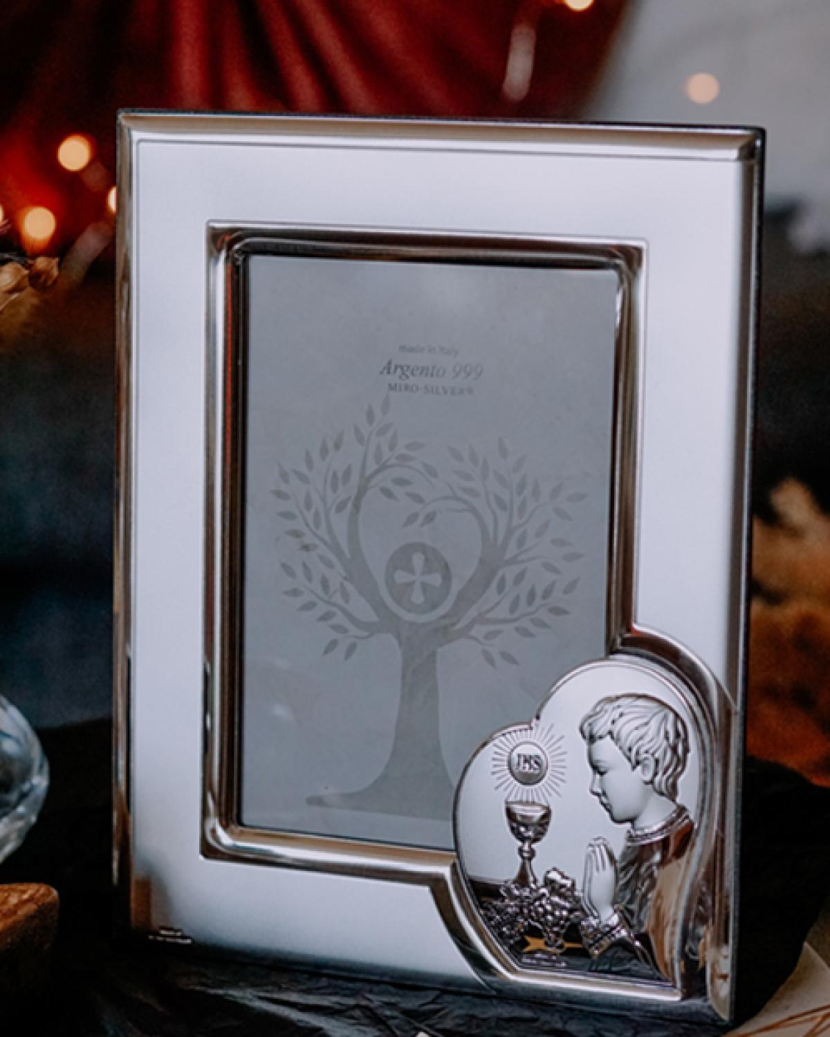 Photo frame for the First Holy Communion with an icon. The icon depicts a chalice, which is an integral attribute in the sacrament of Holy Communion and Confession, and a praying boy. The photo frame will be a wonderful and unforgettable gift for the First Holy Communion.