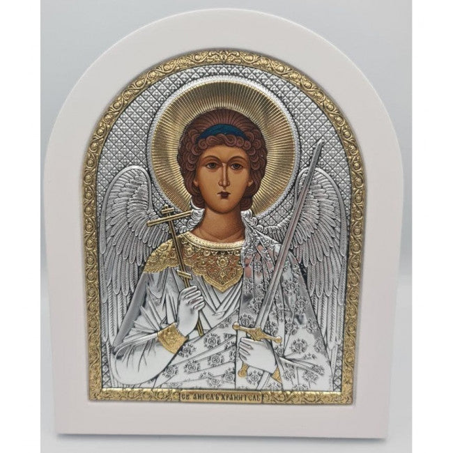 Religious Icon Guardian Angel, Gold Plating and Wooden Base
