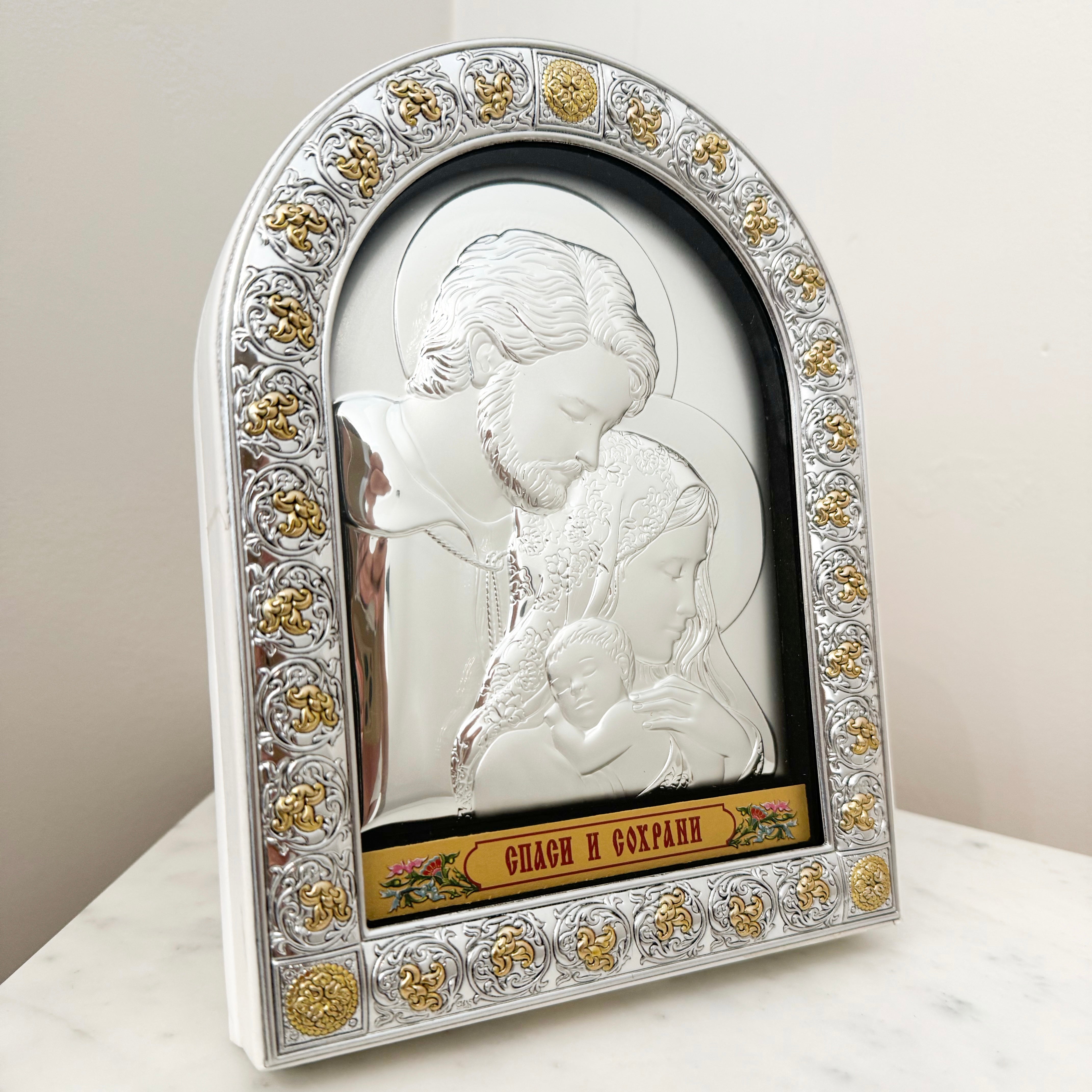 Religious Icon "Holy Family" with Glass and White Faux Leather Back
