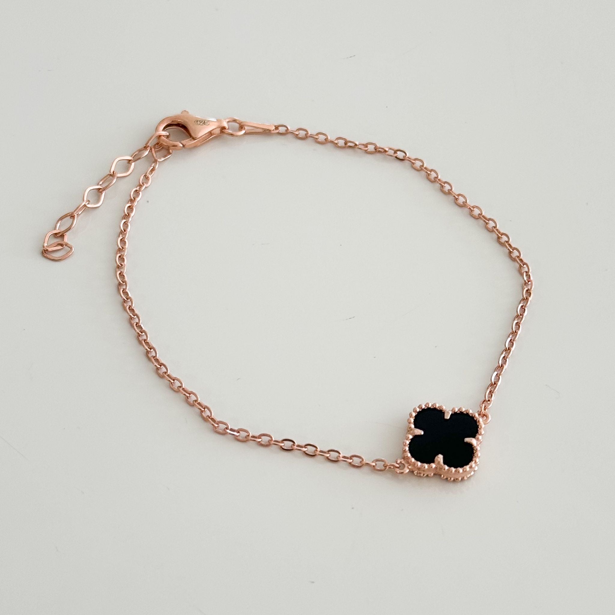 Rose Gold Plated 925 Sterling Silver Clover Bracelet with Onyx