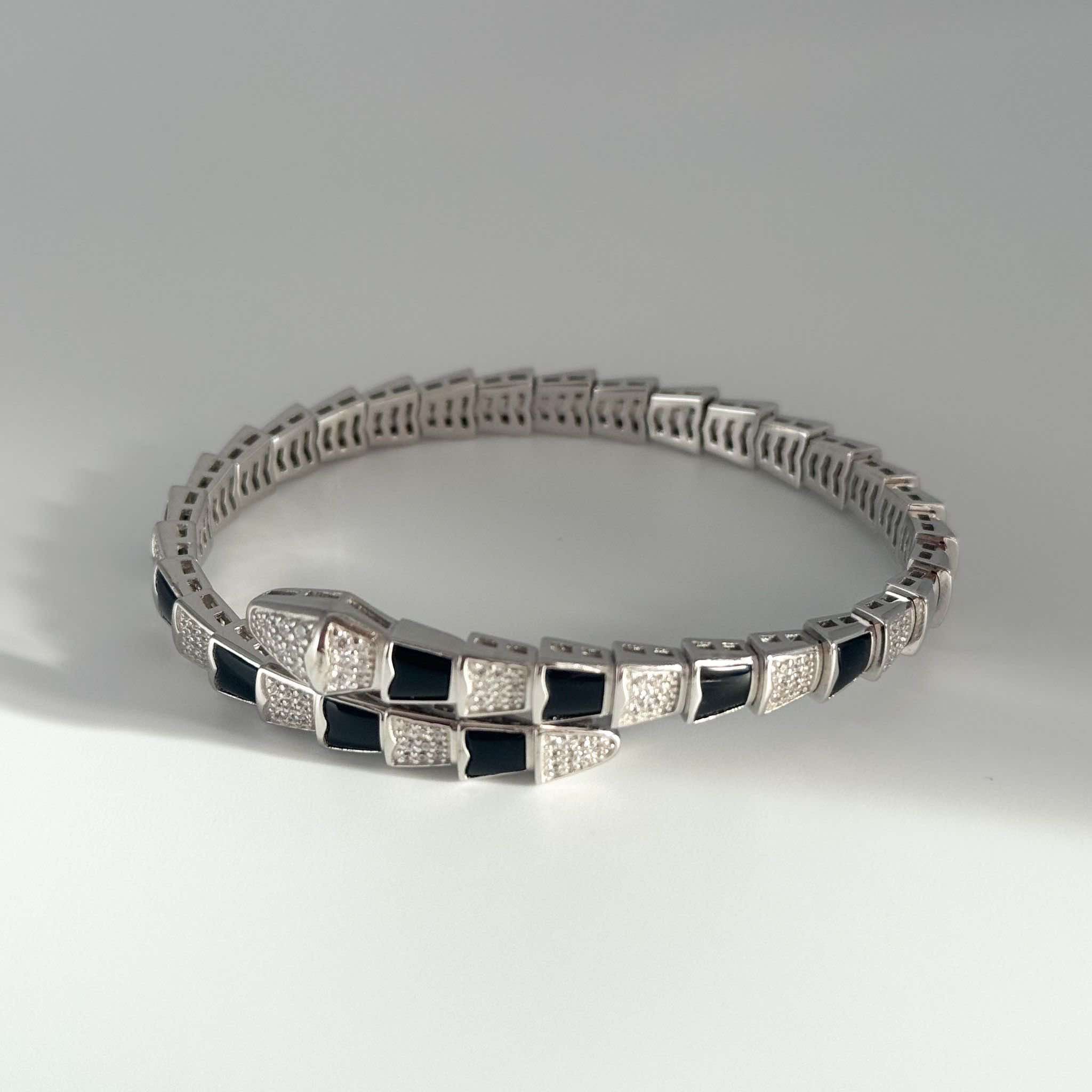925 Sterling Silver Snake Bracelet with Black Enamel and White Cubic Zirconia