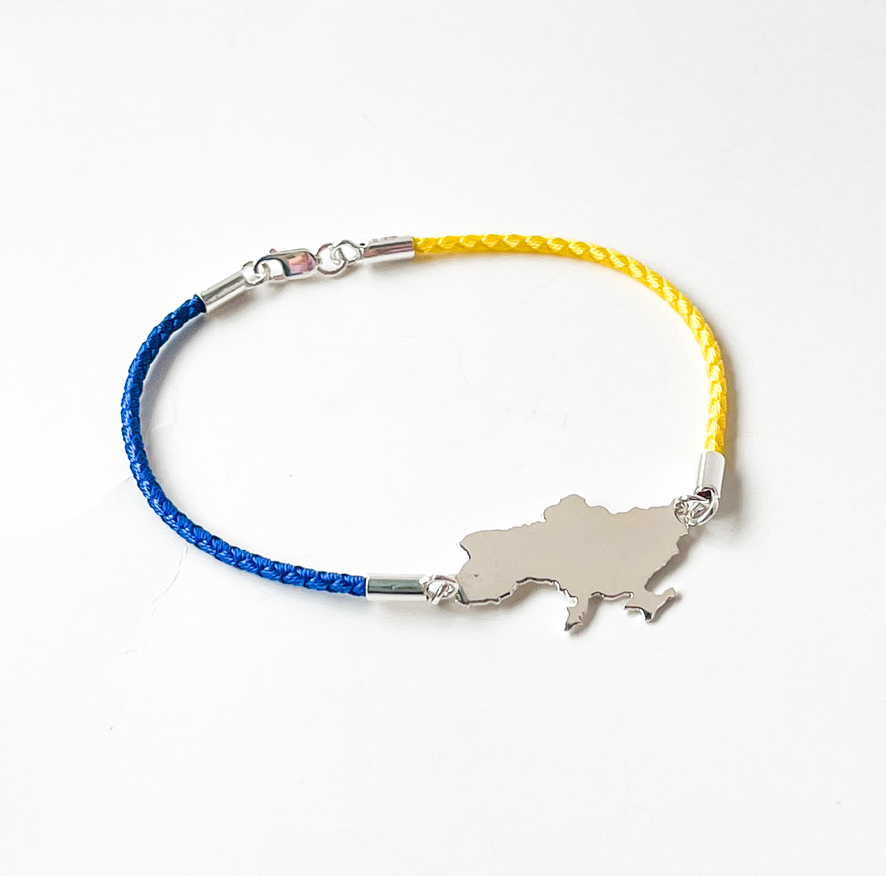 Blue and Yellow Silk Rope Bracelet with 925 Sterling Silver Map of Ukraine