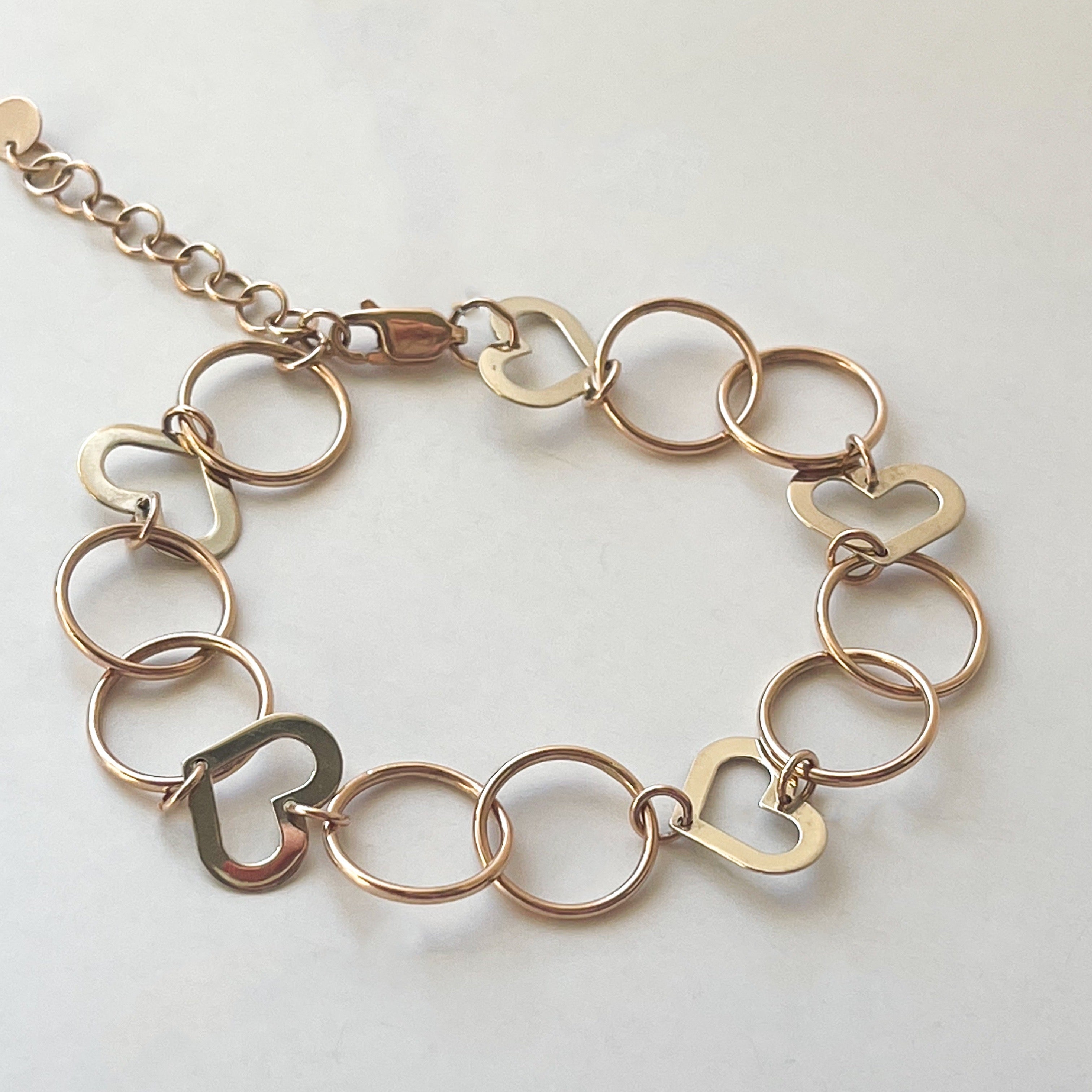 Hearts in 14k white gold and circles in 14k rose gold.