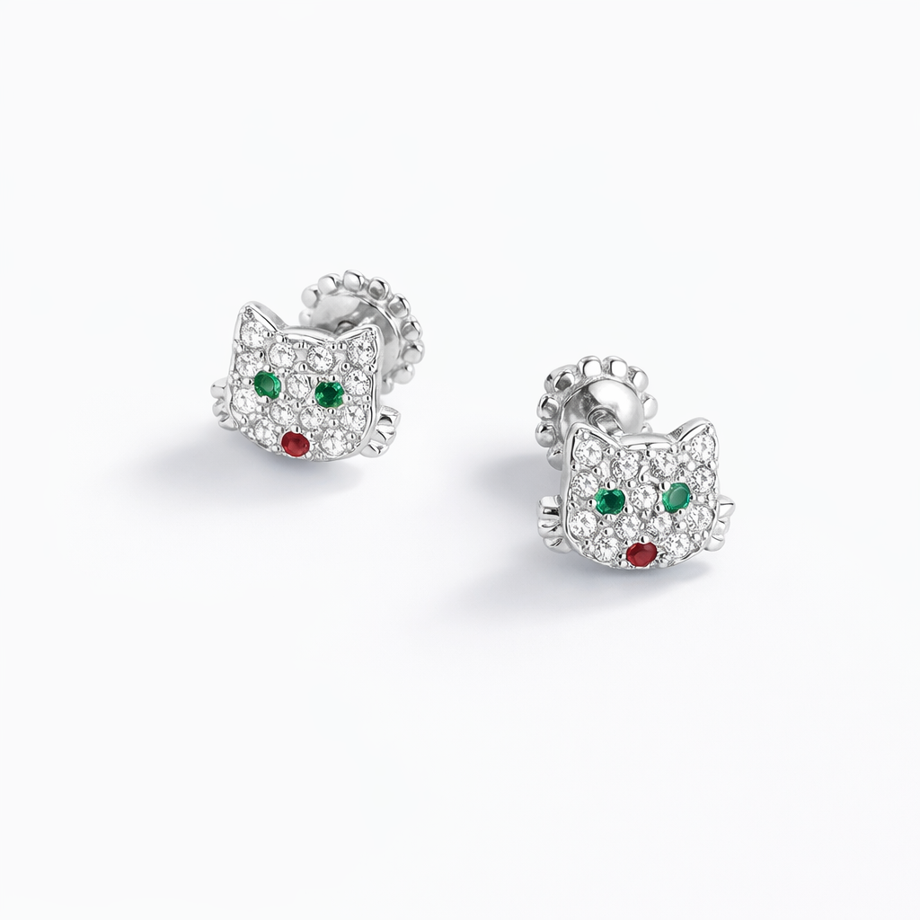 925 Sterling Silver Stud Earrings Cat with Cubic Zirconia