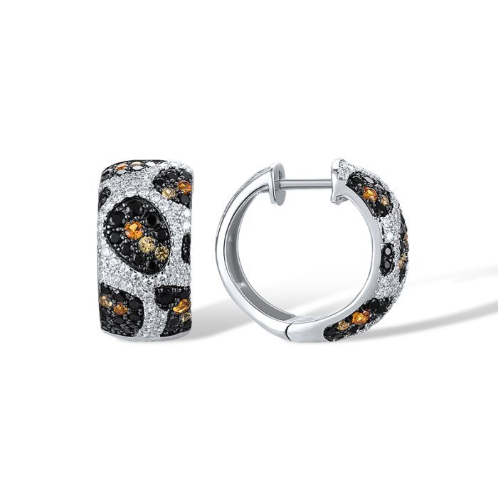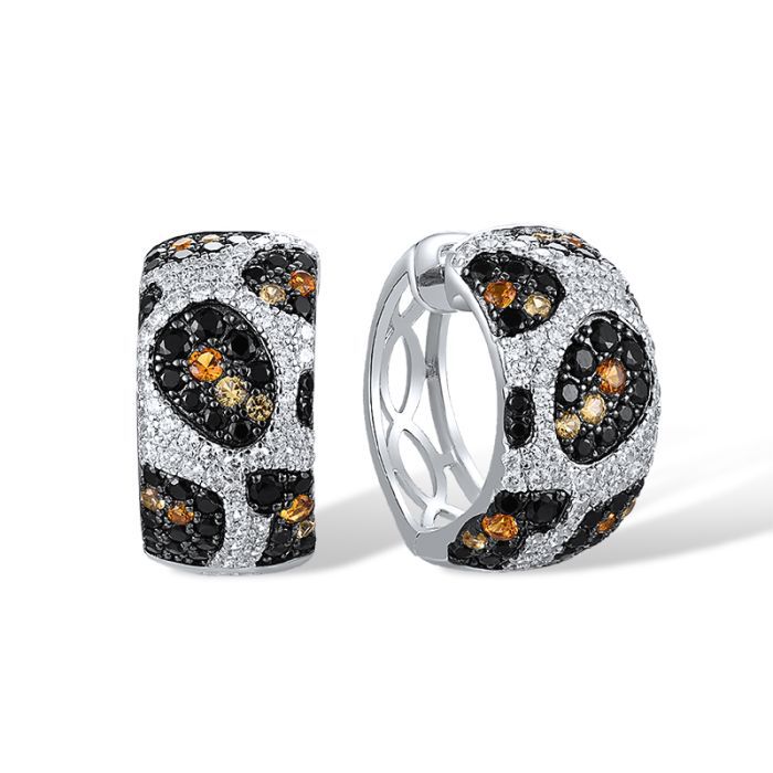 925 Sterling Silver Hoop Earrings "Leopard Print" with Black Spinel, Cubic Zirconia,Yellow Cubic Zirconia