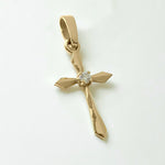 Stylish minimalistic cross in 14k yellow gold decorated with cubic zirconia.