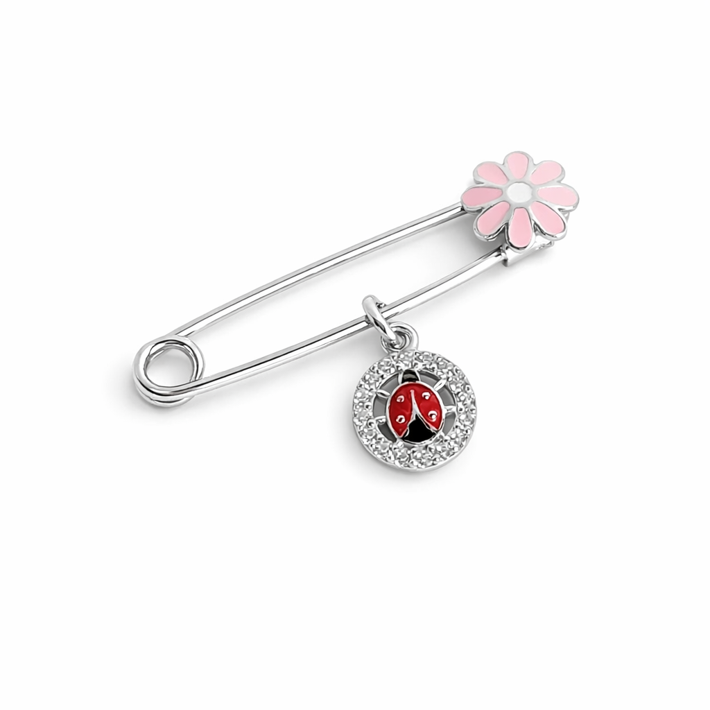 925 Sterling Silver Jewellery Pin Lady Bug and Flower with Enamel and Cubic Zirconia