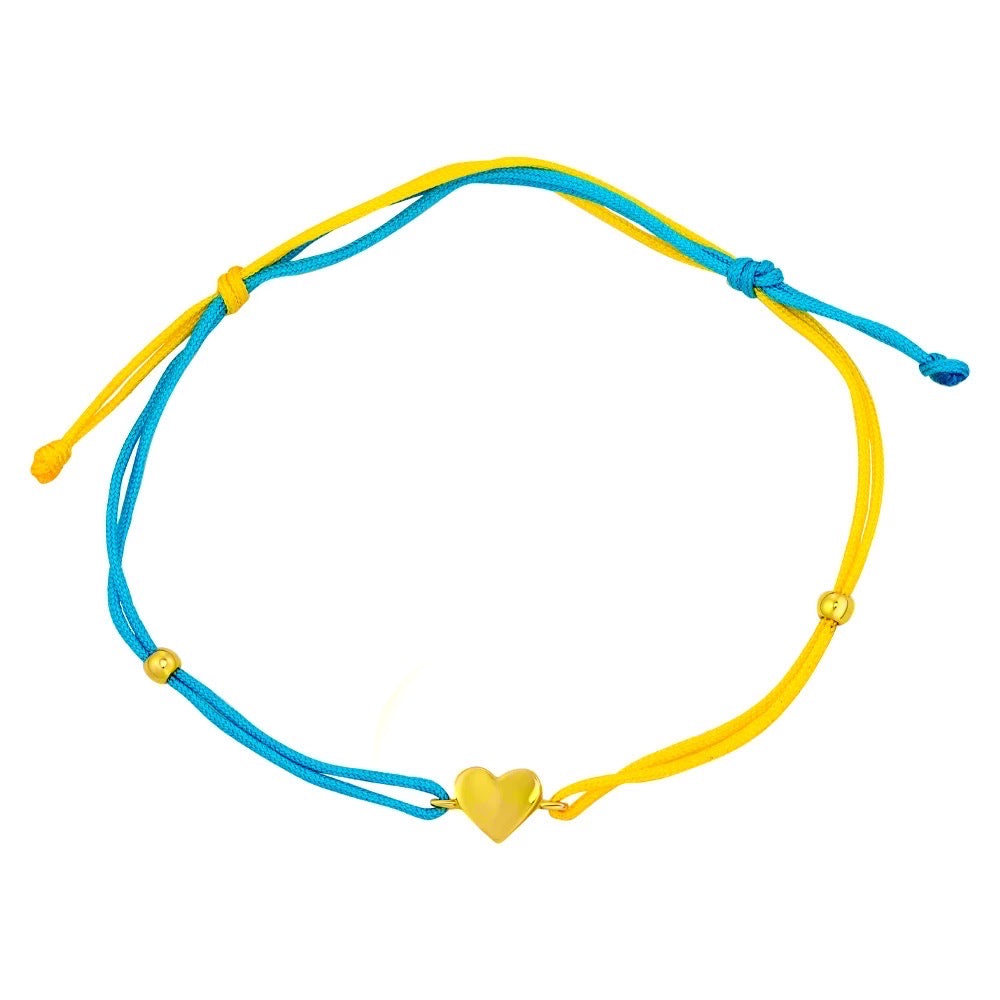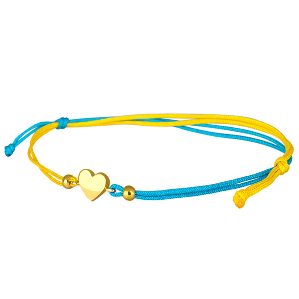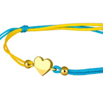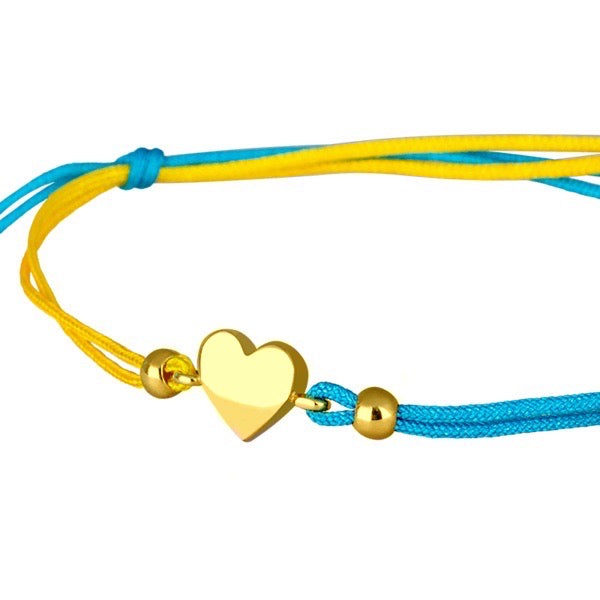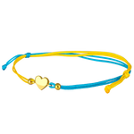 Beautifully crafted, this hand-knotted bracelet features a heart and two ball charms, all set in 14K yellow gold. The bracelet’s two cords are colored with the traditional blue and yellow of the Ukrainian flag. A unique and elegant piece, this bracelet is perfect for those looking to add a special, luxurious touch of patriotism to their wardrobe.