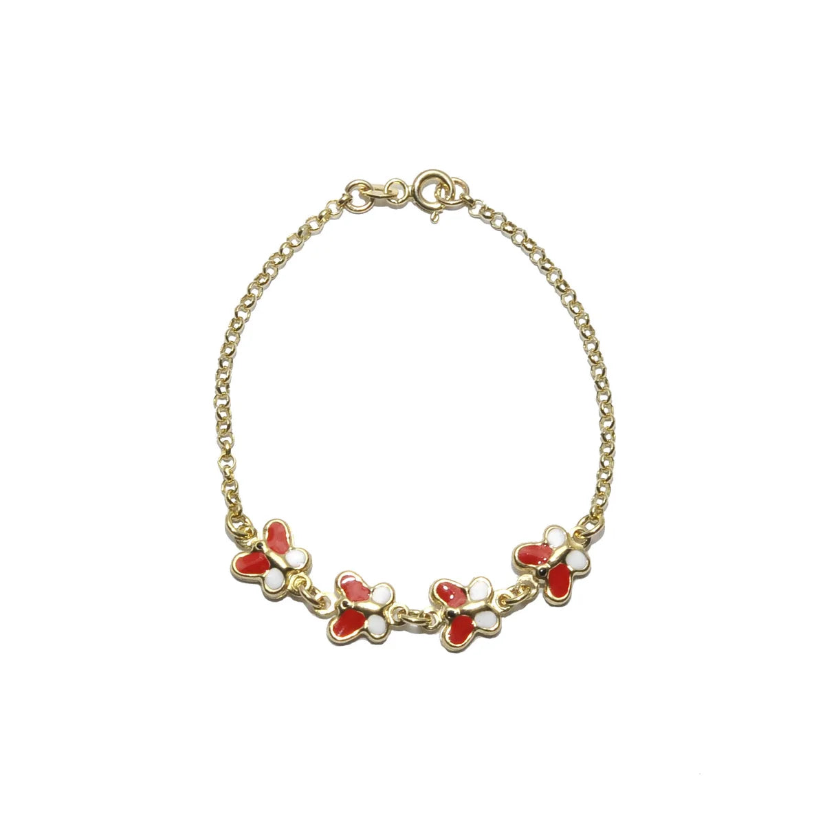 Cute bracelet in 14k yellow gold with red and white enamel butterflies.