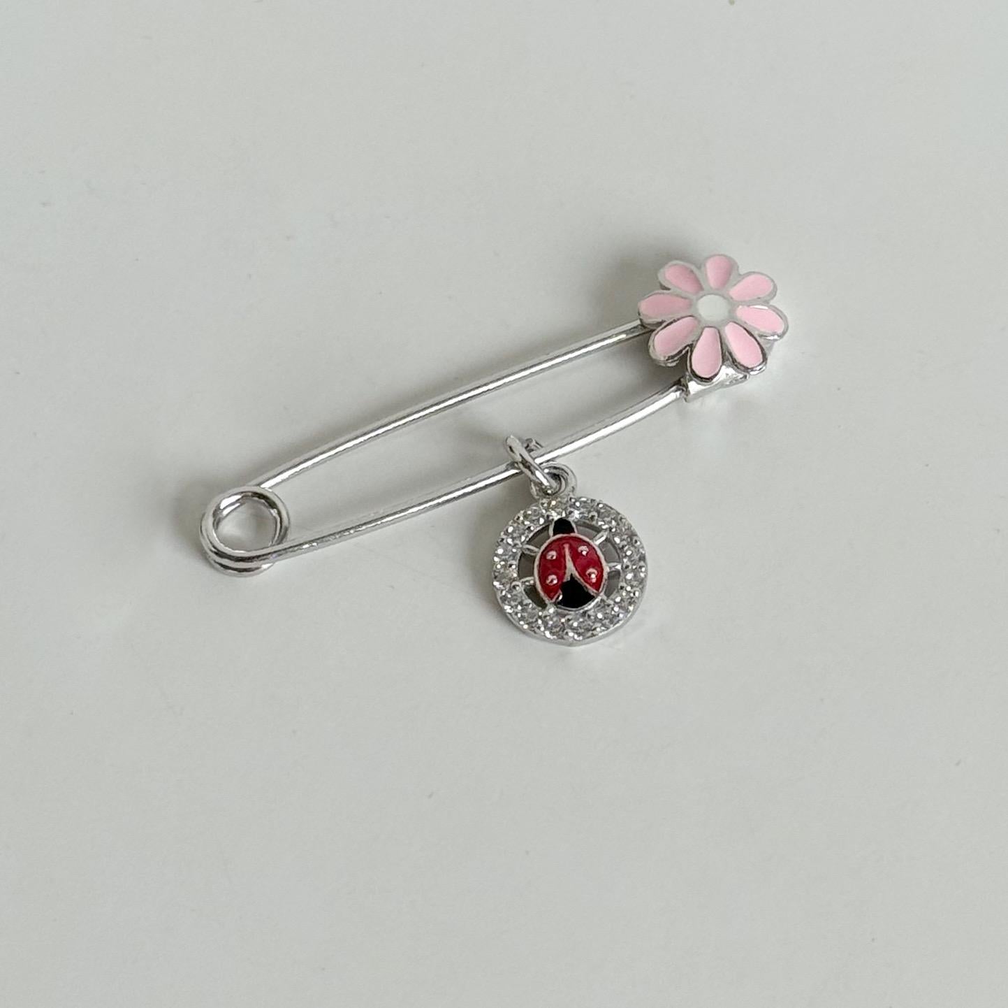 925 Sterling Silver Jewellery Pin Lady Bug and Flower with Enamel and Cubic Zirconia
