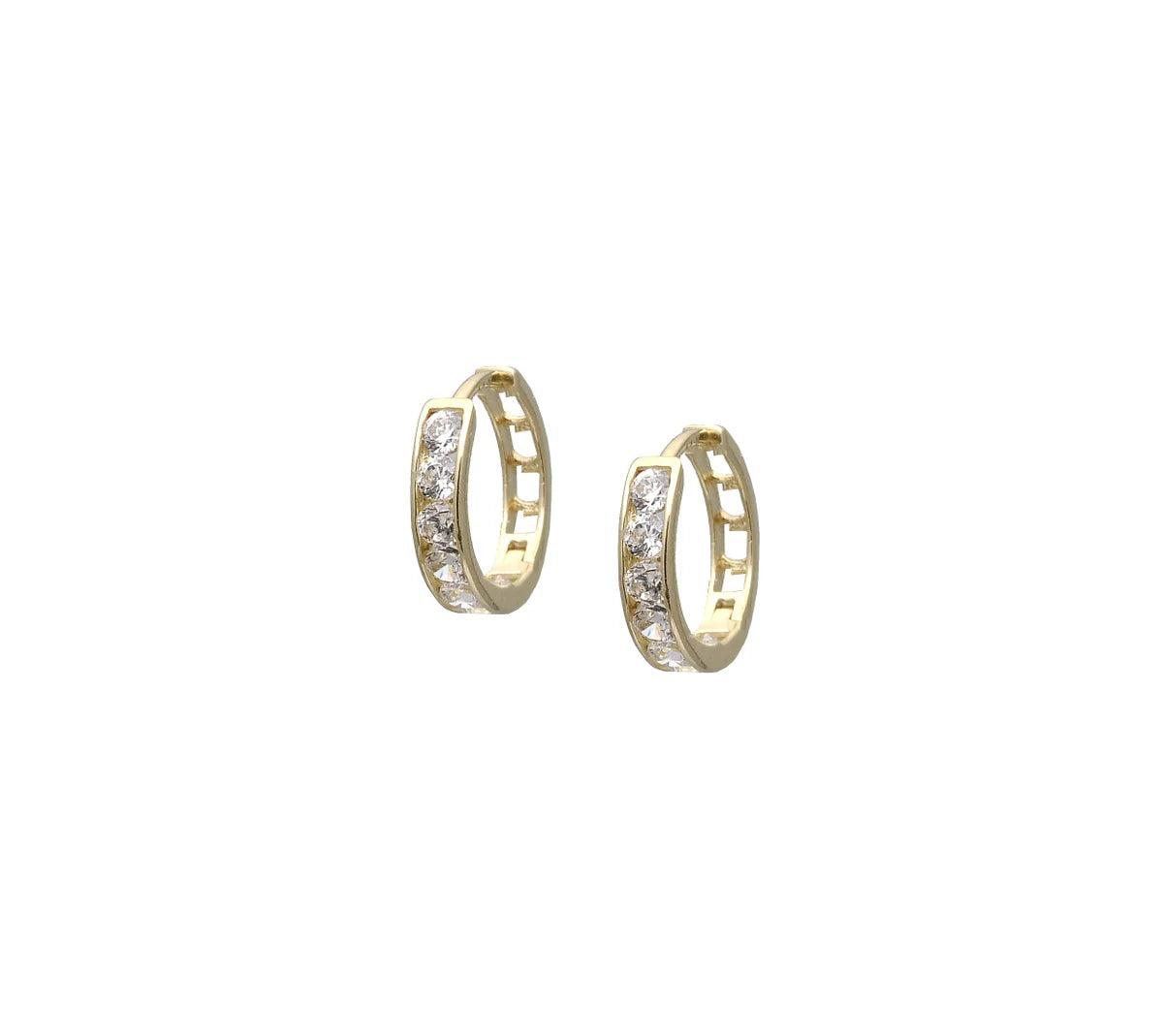 Comfortable and cute hoop earrings decorated with clear cubic zirconia, made in 14K yellow gold.