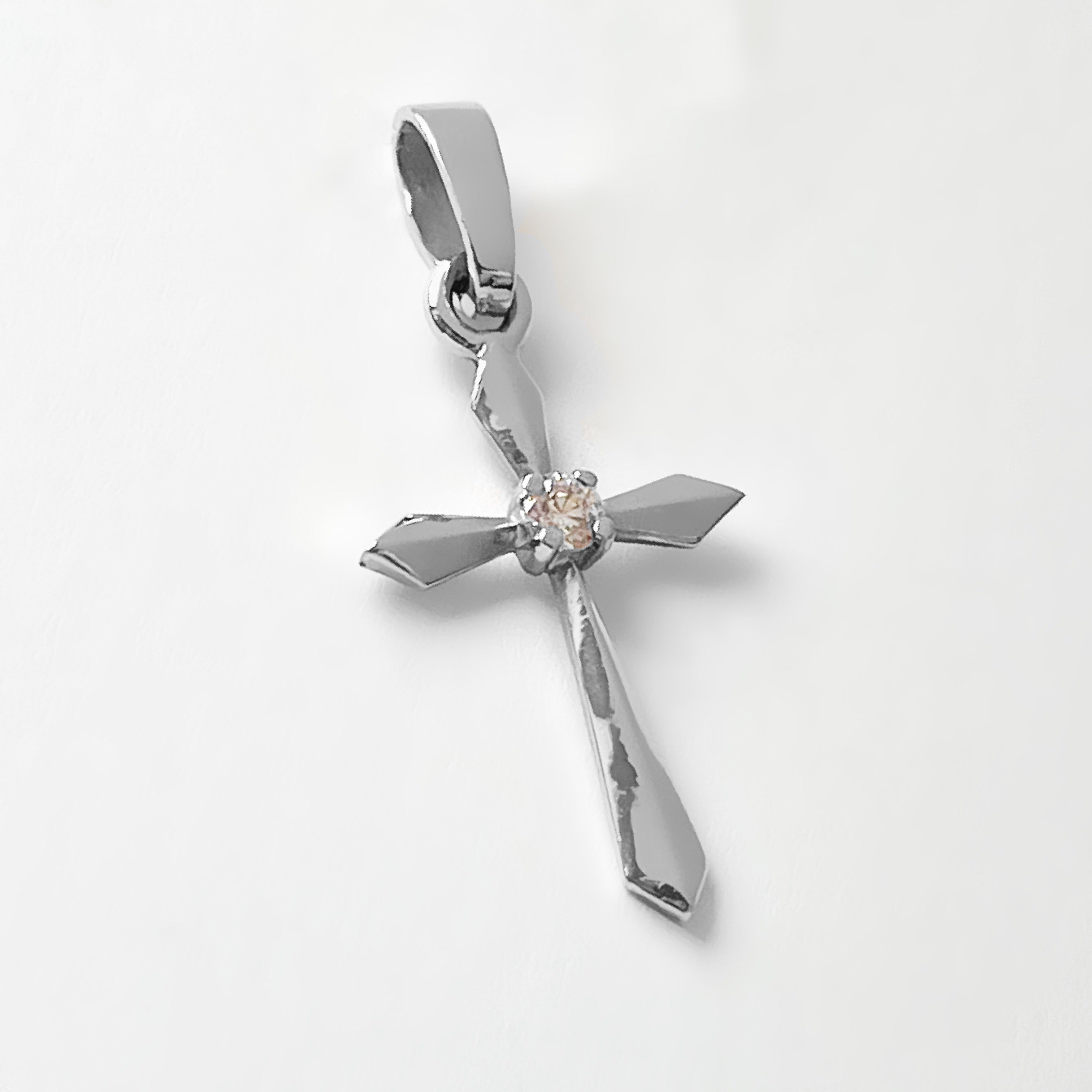 Stylish minimalistic cross in 14k white gold decorated with cubic zirconia central stone.