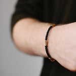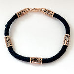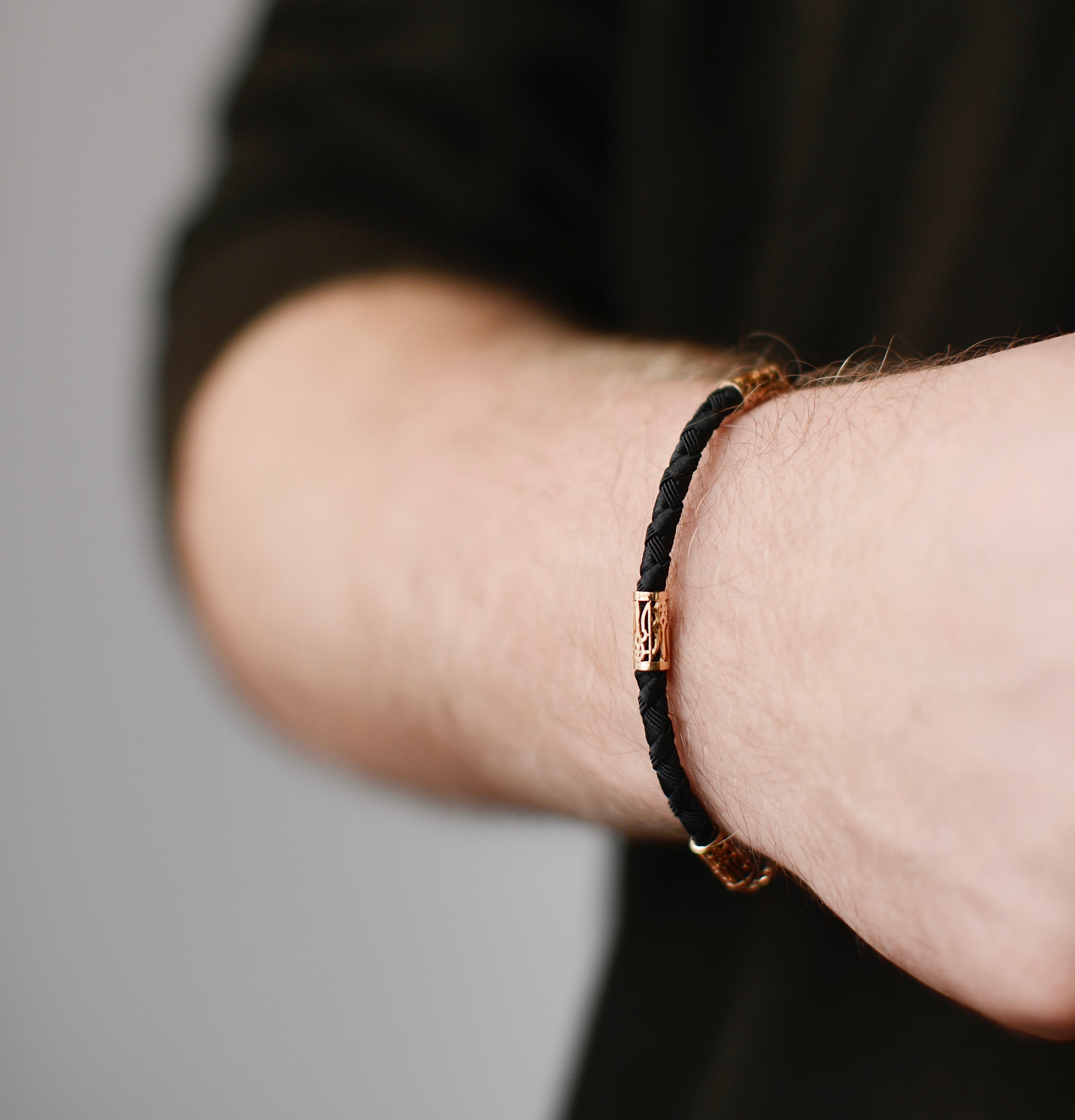 Indulge your sense of style with this luxurious Silk Rope Bracelet, featuring three 14K rose gold tryzubs and a unique lock in an elegant display. Showcase your unique fashion sense with this exclusive mens bracelet - crafted with high-quality silk rope and embellished with the iconic Ukrainian coat of arms.