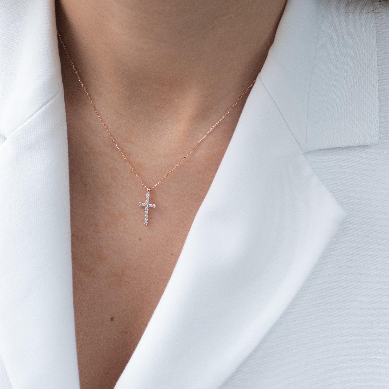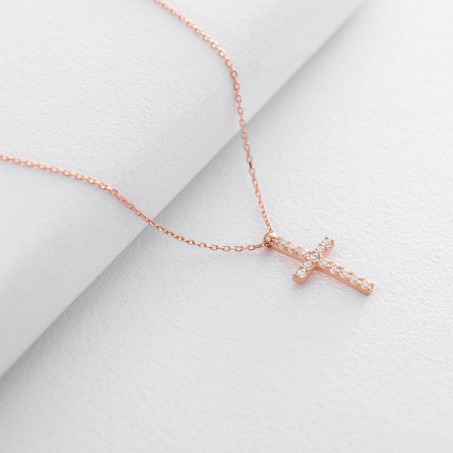 Add some sparkle to your style with our cross necklace in 14k rose gold. This unique piece features a stunning cross pendant with sparkling cubic zirconia accents.