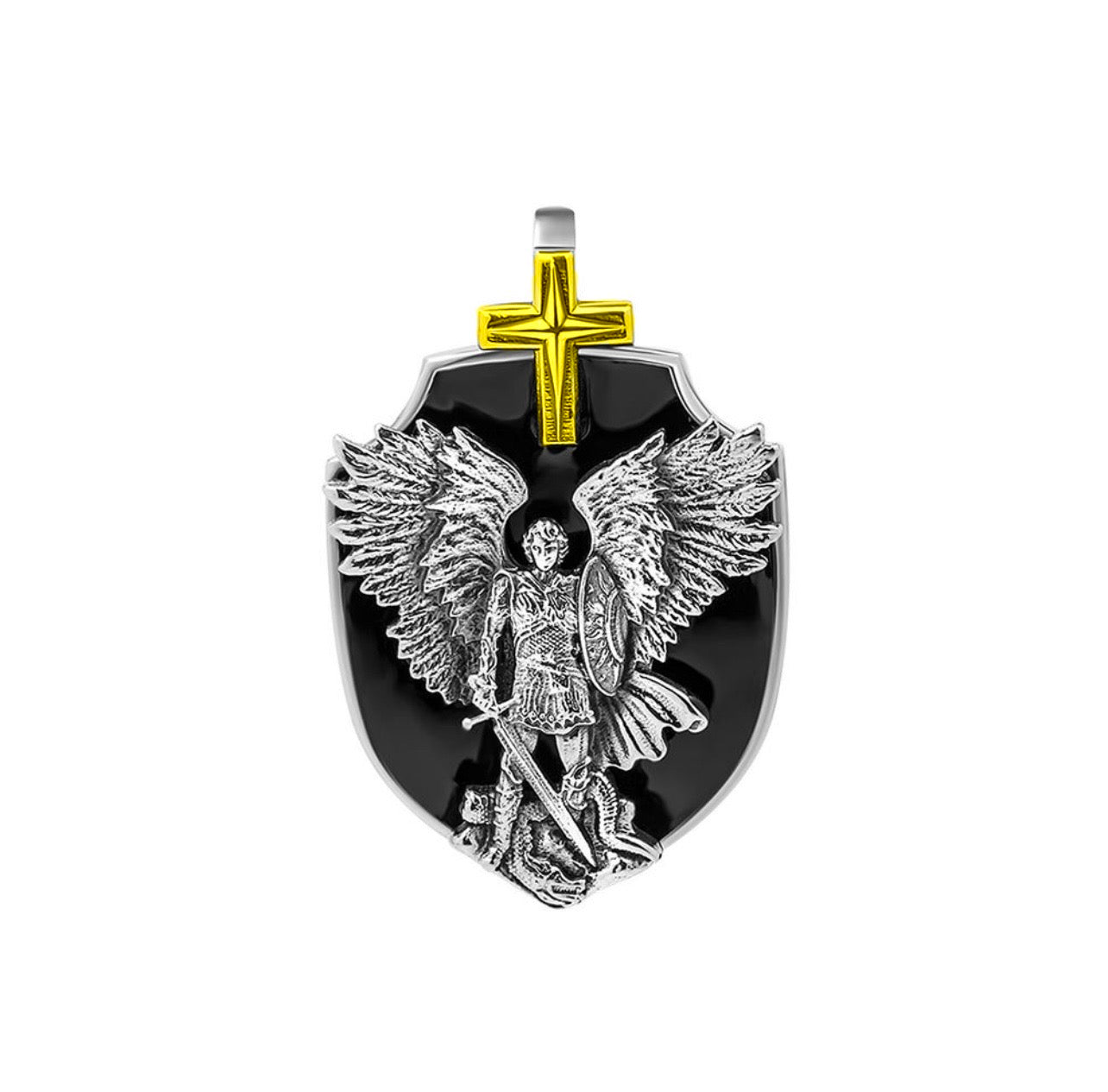 925 Sterling Silver Pendant "Archangel Michael” with Onyx and Yellow Gold Plating