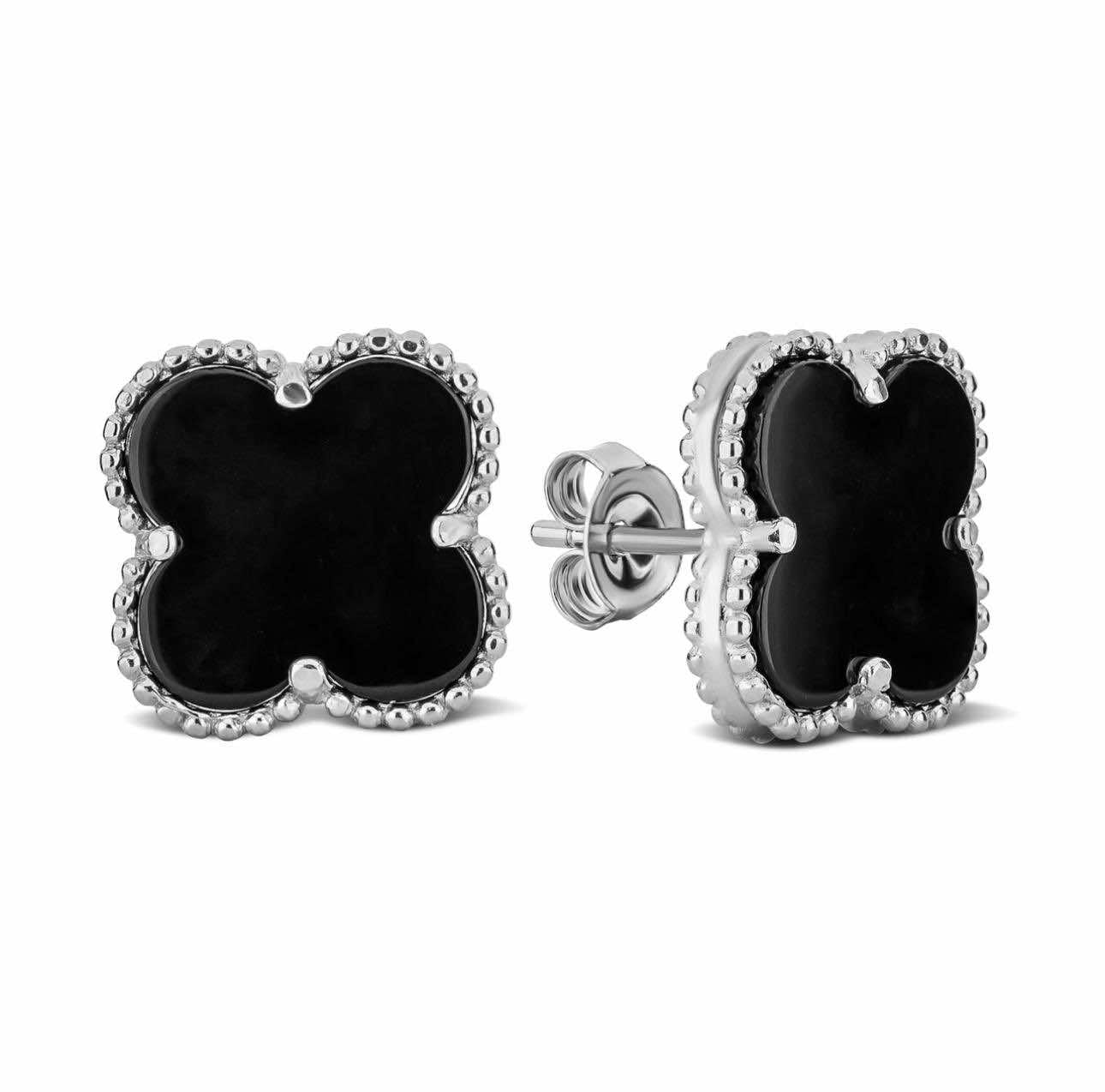 925 Sterling Silver Stud Earrings Clover with Onyx