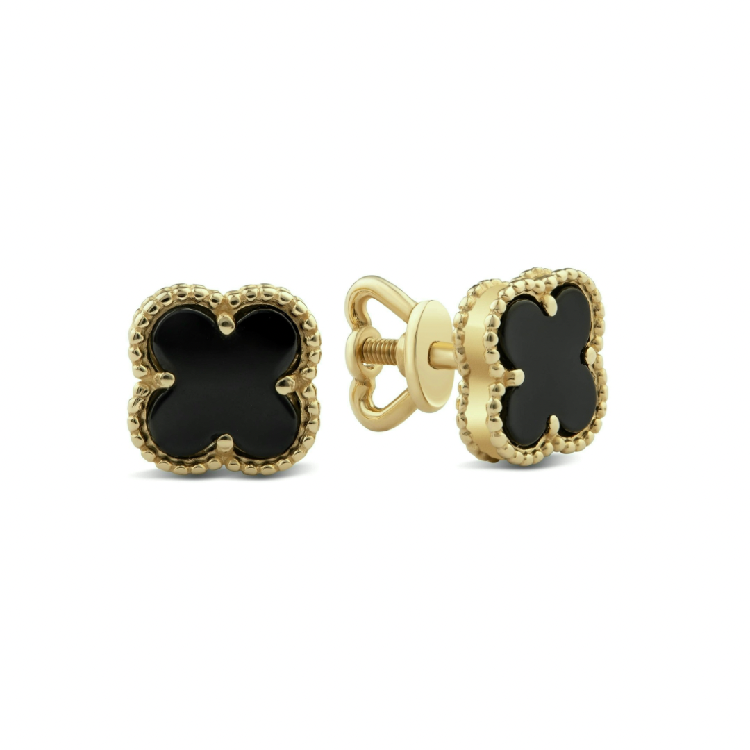 Stud Earrings in 14K/585 Yellow Gold with Onyx Clover