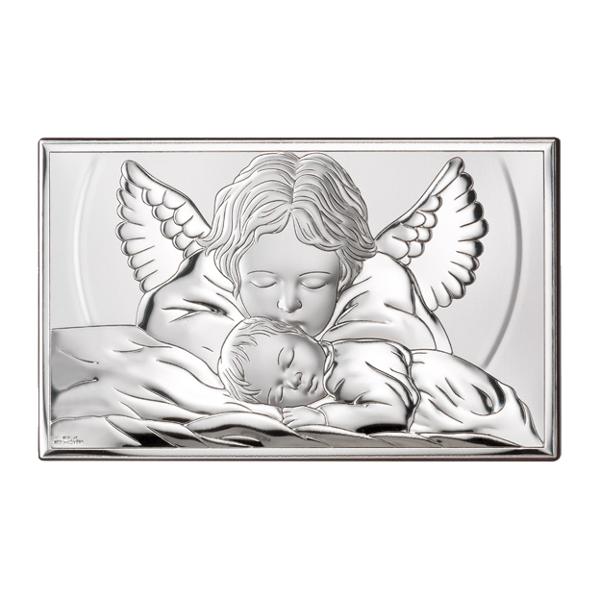 This panel featuring guardian angel covering a sleeping baby is perfect for a Baptism ceremony. Crafted with care, this detailed design will create a lasting memento of the special day.Â