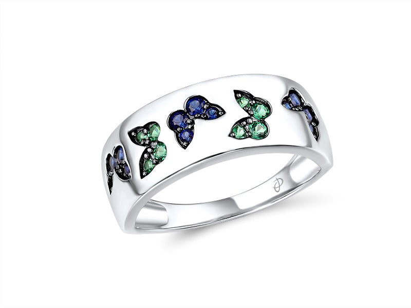 Sterling Silver Ring Created Sapphire and Green Spinel Butterflies