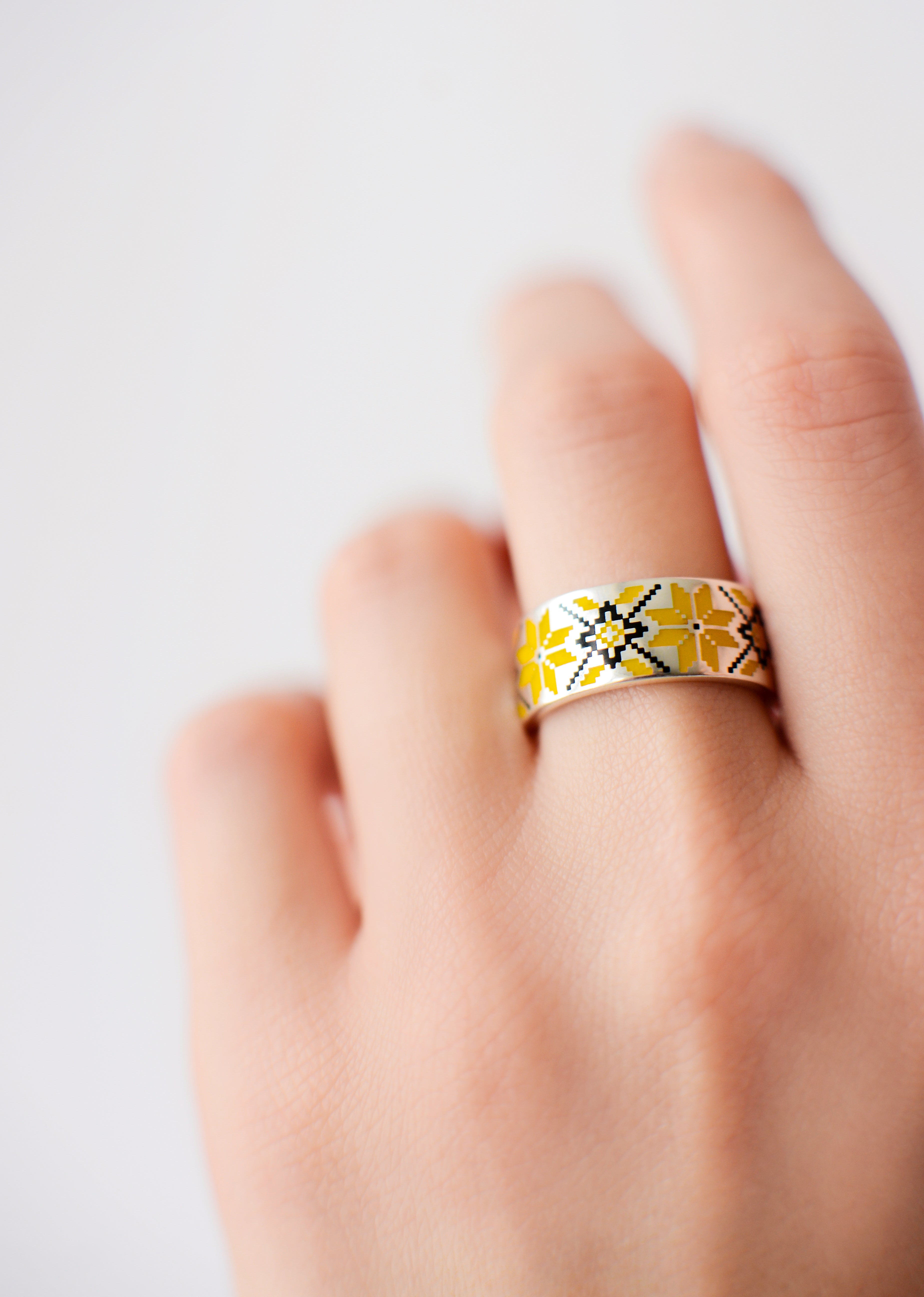 This elegant 925 Sterling Silver Vyshyvanka Ring with Enamel is a stunning addition to any jewelry collection. Crafted from sterling silver and decorated with stunning enamel, this gorgeous ring is sure to become a conversation-starter. A perfect blend of traditional and modern styling, the ring is timeless and will remain a favorite for years to come.